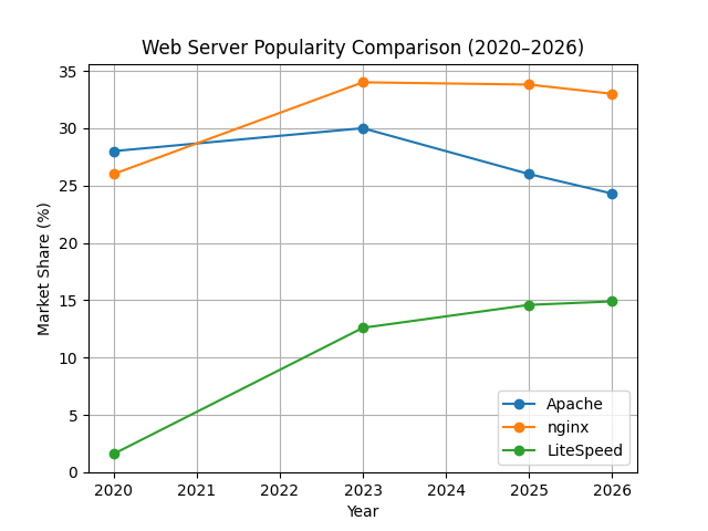 There is a long-standing debate concerning which web server is the best, and specifically, which is best for hosting WordPress websites. The main contenders are Apache, Nginx, and LiteSpeed (sometimes Apache and Nginx are used together as a sort of tag team). Apache is the old guy, a great boxer in his day, but these days, he is considered a little slower than the younger guys—or certainly less cool. Nginx is a crowd favorite because, like Apache, it is free and open source. Plus, Nginx is a very capable workhorse that the majority of web hosting companies have adopted and currently have in production. Check out the popularity chart below.